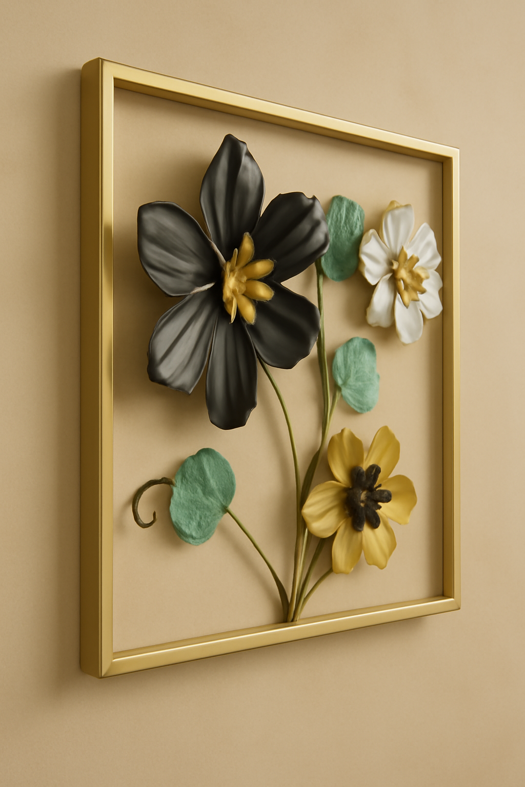 Infuse your space with modern calm and earthy charm with our Botanical Harmony Metal Wall Frame. Featuring a beautifully balanced arrangement of matte black, deep gold, ivory white, and sage green petals, this 18″ x 18″ frame is the perfect fusion of nature-inspired design and contemporary elegance.