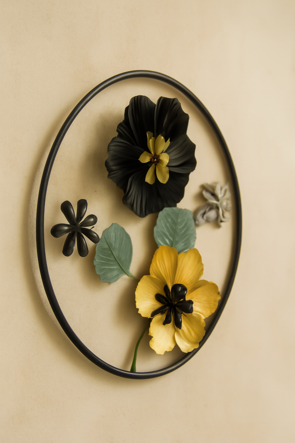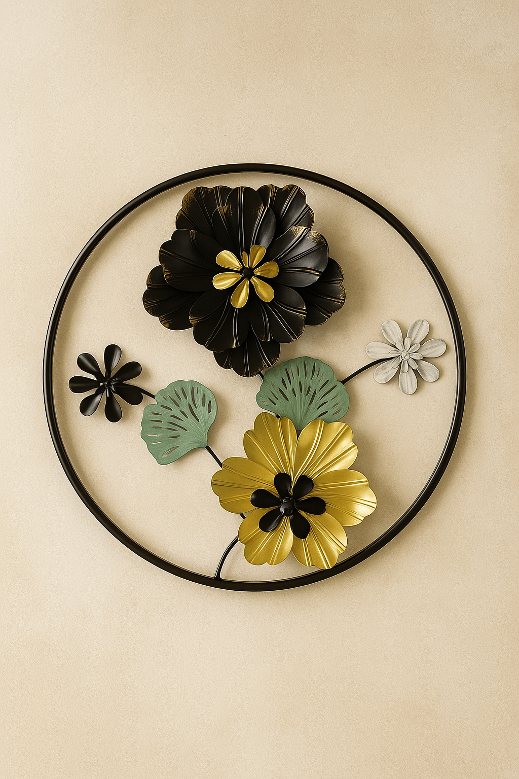 Bring timeless elegance to your space with our 18-inch round floral metal wall art, handcrafted with exquisite detail and a premium matte finish. Featuring golden petals, black metal bloom, and soft pastel leaves – this piece adds a luxurious yet calming accent to any wall.